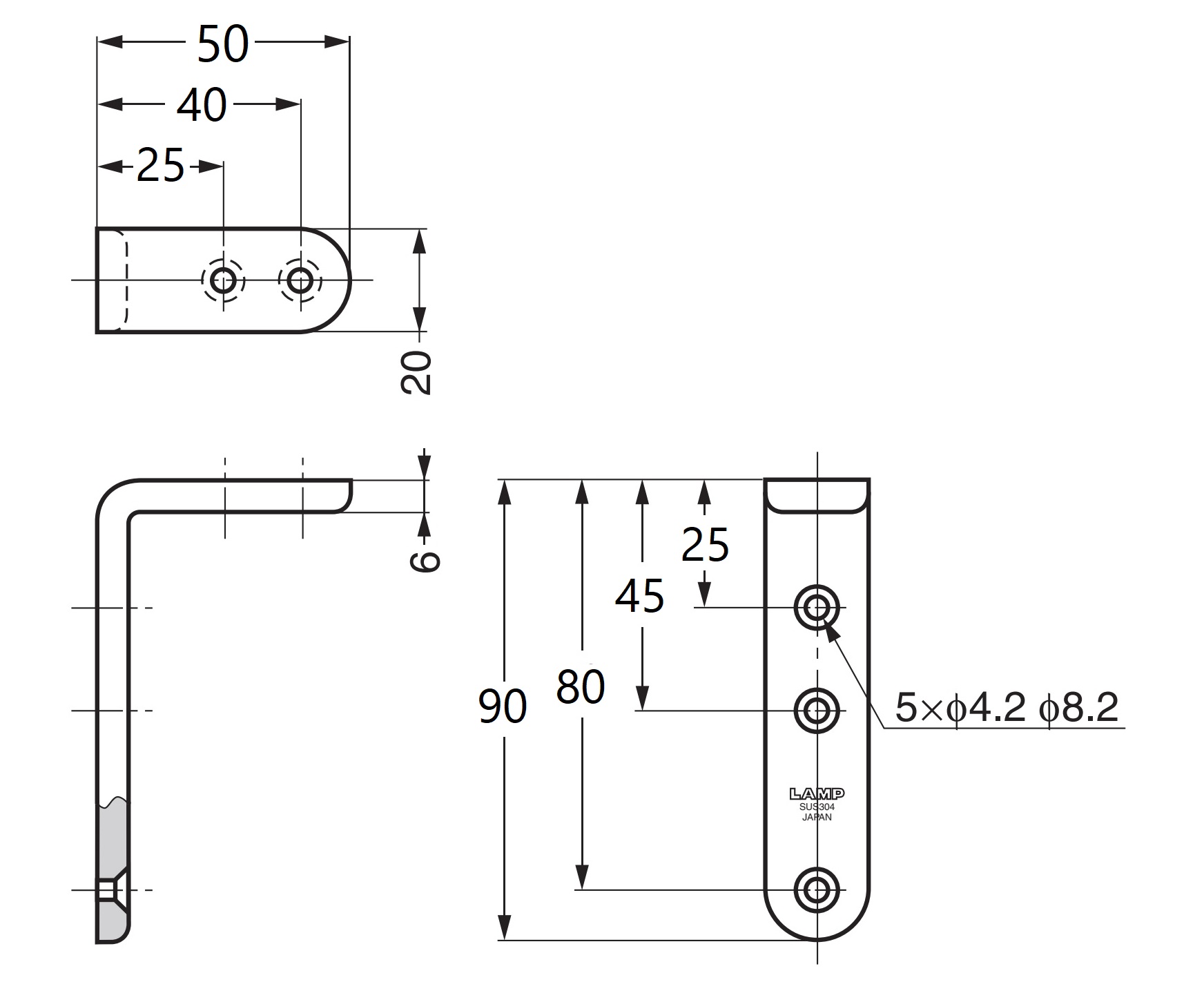 Høykvalitets rustfri monteringsbrakett, SU-B50M, 90 mm, fra Sugatsune, lastekapasitet: 26 kg (58 lbs). Teknisk tegning